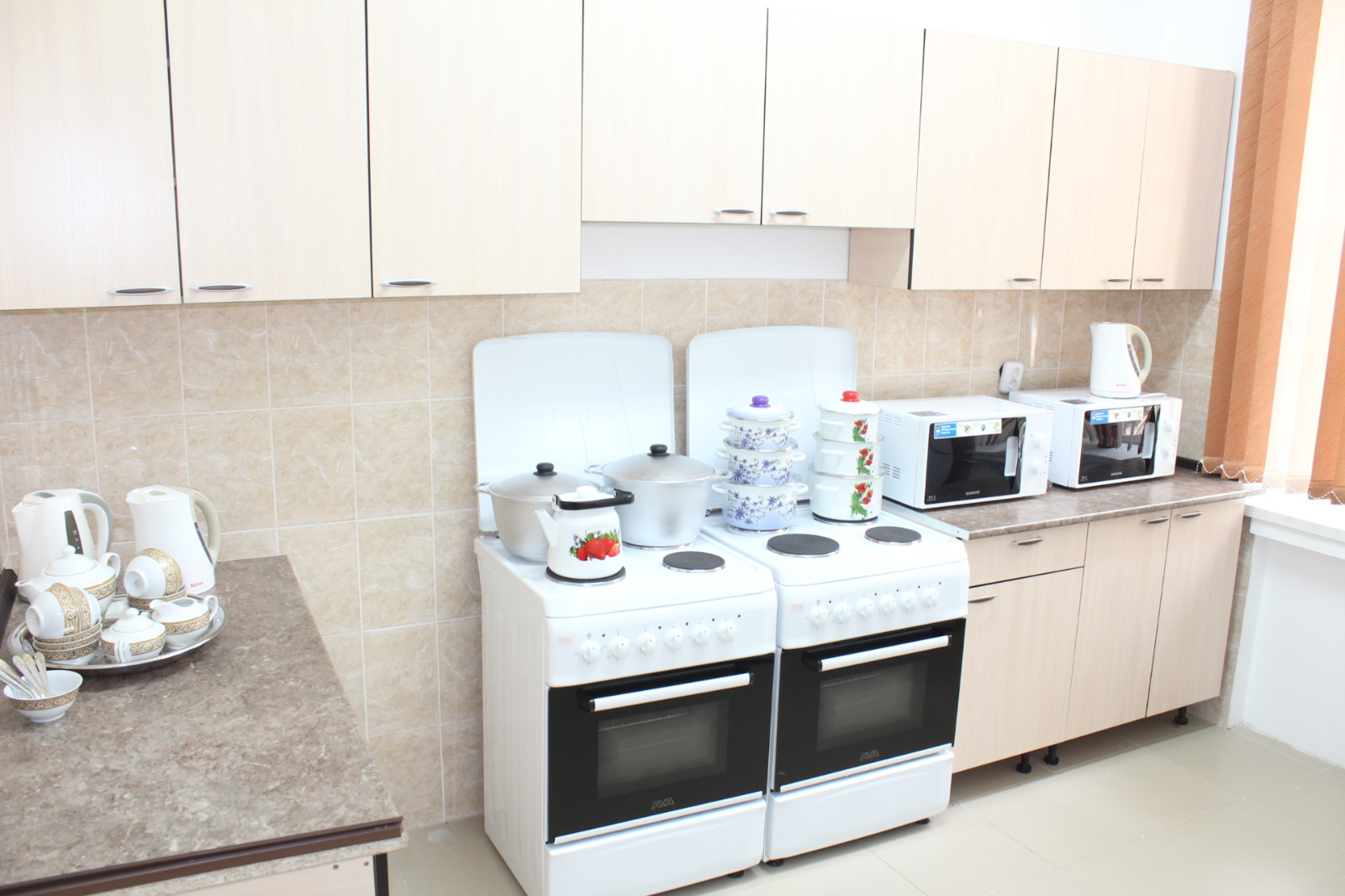 В здании общежития имеется просторная кухня с необходимой современной бытовой техникой и инвентарем: холодильниками, электроплитами, микроволновыми печами, чайниками, посудой.